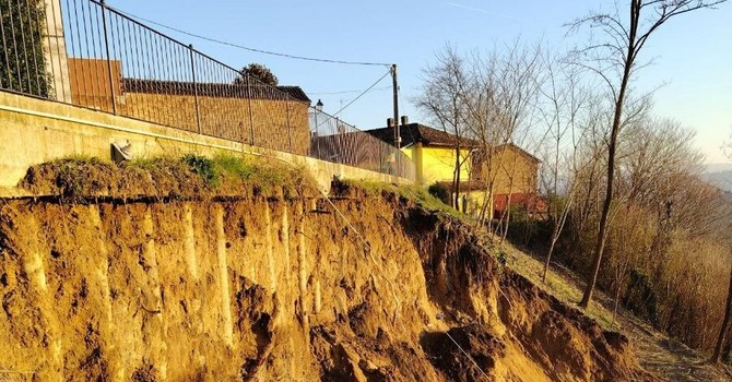 Moasca, frana sotto il castello: crolla una porzione di collina, chiusa via Ghigetto e paese senz’acqua