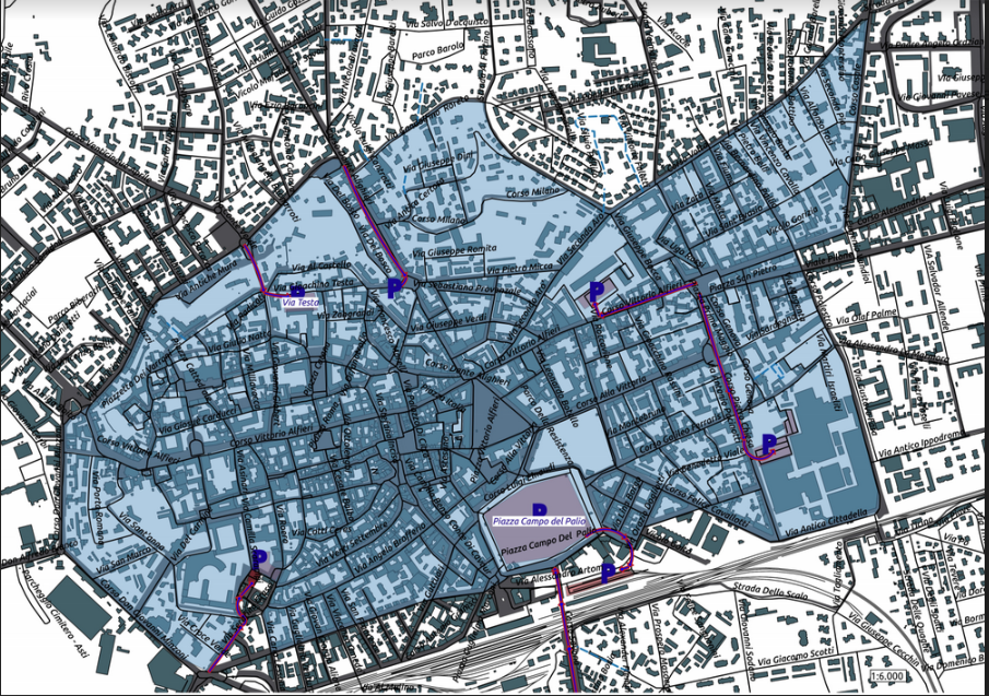 Fermo restando la possibilità per tutti i veicoli di raggiungere, seguendo la via più breve sia in entrata che in uscita, i “parcheggi di attestazione” dove i mezzi potranno sostare consentendo poi di spostarsi nel centro a piedi. I parcheggi individuati sono quello di piazza Campo del Palio, ex Way Assauto, Area Fabrizio de Andrè (ex Caserma Colli di Felizzano), via Natta (area interna su due piani) e il parcheggio del Tribunale (piazza G. Pasta/via G.G. Govone).