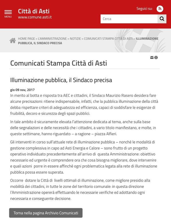 “Sul problema dell’illuminazione pubblica in piazza Alfieri il sindaco Rasero è in ritardo di un anno: risponde oggi con le stesse promesse già contenute in un comunicato stampa diffuso il 9 novembre 2017 (nell'immagine)”.