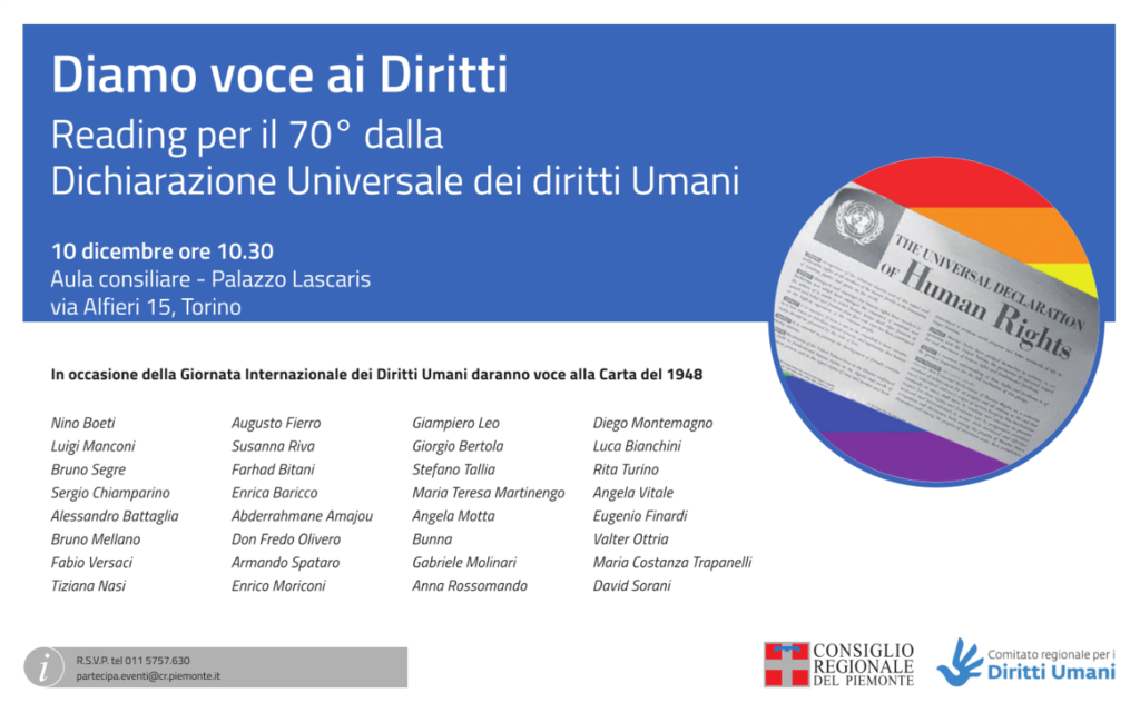Nel corso dell’appuntamento, volti noti (tra gli altri, il presidente Chiamparino, il cantautore Eugenio Finardi, lo scrittore Luca Bianchini, il capo della Procura della Repubblica presso il Tribunale di Torino Armando Spataro) e meno noti, si alterneranno nella lettura degli articoli della Dichiarazione Universale del 1948, dando il loro contributo sul significato e il valore dei Diritti enunciati nella Carta promulgata settant’anni fa.
