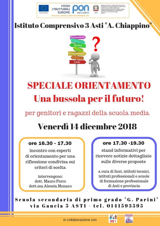 Nella giornata di domani, venerdì 14 dicembre, la scuola secondaria di primo grado "G. Parini" dell'I.C.3 Asti aprirà le sue porte per un pomeriggio straordinario dedicato all'Orientamento. Un momento particolare per trovare le coordinate e tracciare il proprio percorso di crescita. Sarà un’occasione importante, sia per gli studenti che per le loro famiglie, per incontrare docenti e studenti delle Scuole secondarie di secondo grado e delle Agenzie formative; conoscere la loro offerta scolastica e formativa, ottenere materiali e informazioni utili, conoscerne le iniziative.