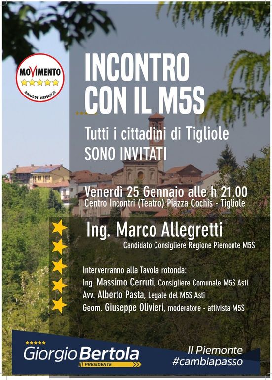 Il Movimento 5 Stelle incontrerà i cittadini alla presenza del Candidato Consigliere Regione Piemonte M5S Marco Allegretti.
