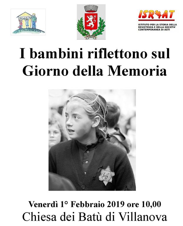 I bambini delle scuole di Villanova d’Asti dedicano la mattina di venerdì 1 febbraio allo scambio di pensieri su tematiche correlate al Giorno della Memoria. Venerdì, 1° febbraio alle ore 10 presso la Confraternita dei Batù, si terrà l’iniziativa:”I bambini riflettono sul giorno della memoria” con la partecipazione dell’Amministrazione Comunale.