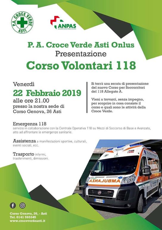 Venerdì 22 Febbraio 2019, alle ore 21, presso la sede della Croce Verde in corso Genova 26 ad Asti, si terrà la serata di presentazione del corso per i nuovi Volontari soccorritori 118