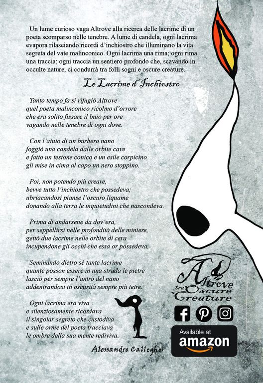 "A tutti è capitato per una volta almeno di ritrovarsi assenti con lo sguardo incantato lontano dal mondo dei presenti. Assorti in un altro luogo, un regno interiore, un angolo fuori luogo che io chiamo Altrove. Altrove... Altrove tra oscure creature vaga un lume prudente che tra lacrime e paure cerca sempre qualcosa laddove per molti c'è niente".