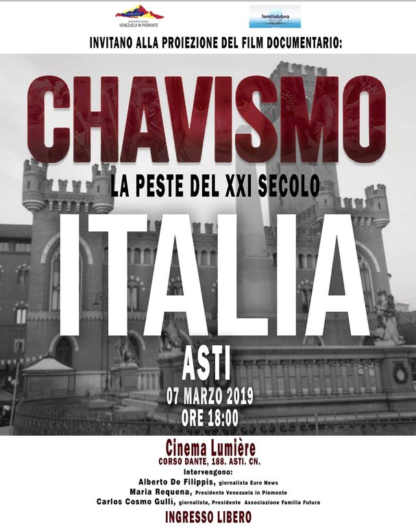 Il 7 marzo saranno presenti in sala come relatori il giornalista di Euronews Alberto De Filippis, reporter e testimone recente; il giornalista Carlos Cosmo Gullì, presidente Ass. Familia Futura e Maria Requena, presidente della Ass. Venezuela in Piemonte. Le Associazioni Promotrici sono Familia Futura e Venezuela in Piemonte.