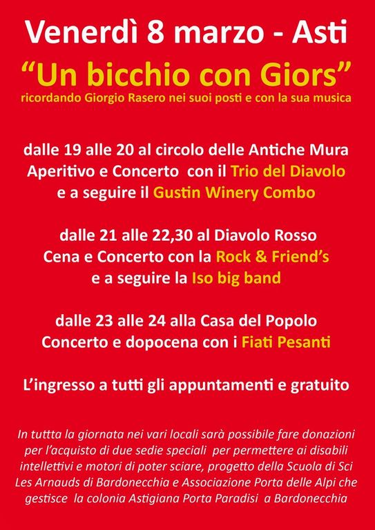 A dieci mesi dalla scomparsa di Giorgio Rasero, Maestro dei Fiati Pesant, un evento lo ricorda "con i suoi posti e la sua musica", tra il circolo Antiche Mura, il Diavolo Rosso e la Casa del Popolo.