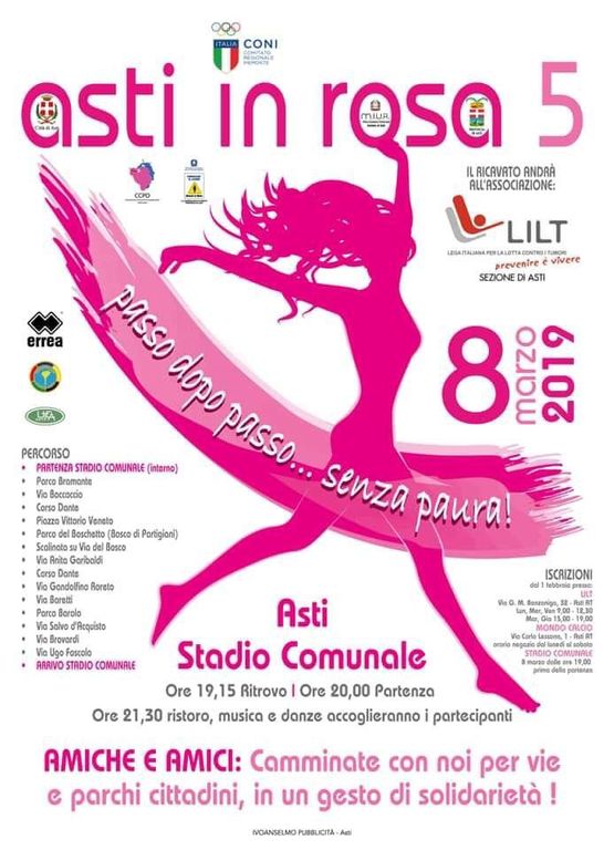 Si ripropone infatti l’iniziativa Asti in Rosa, ideata dalla referente provinciale del Coni Lavinia Saracco a sostegno della Lega italiana per la Lotta contro i Tumori che è, fin dall’inizio, uno dei “motori” della manifestazione, con Provincia, Comune di Asti e Coni, quest’anno collabora il Comitato Palio Rione Don Bosco.