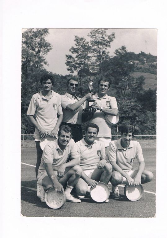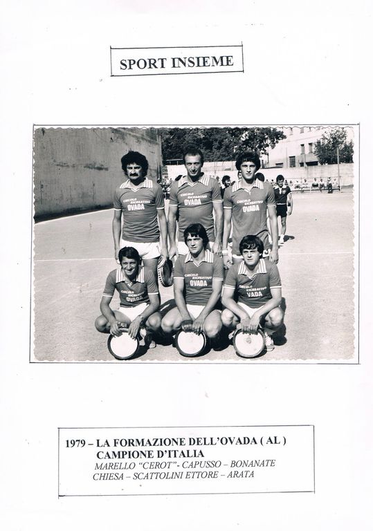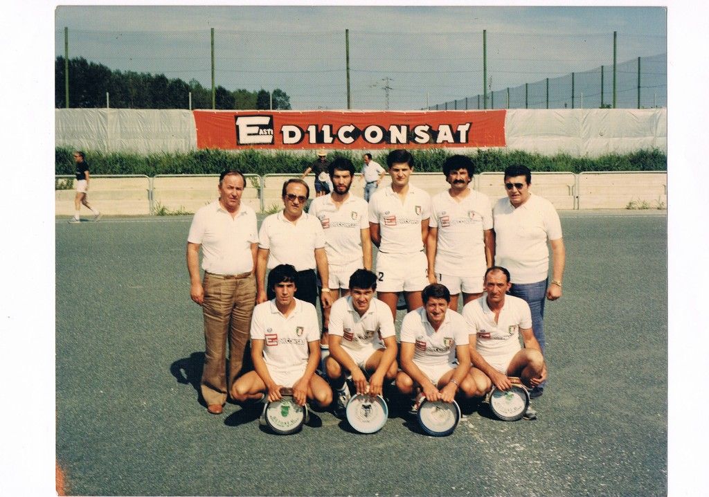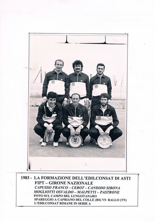 - Foto 6: 1983, la formazione dell'Edilconsat di Asti FIPT - GIRONE NAZIONALE - Capusso Franco - Cerot - Candido Sibona - Mogliotti Osvaldo - Malpetti - Pastrone. Foto sul campo del Lungotanaro. Spareggio a Capriano del colle (BS) vs Rallo (TN). L'edilconsat rimane in serie A