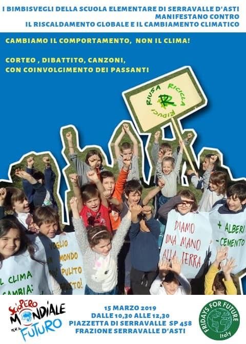 Anche i Bimbisvegli della scuola elementare di Serravalle d'Asti prenderanno parte all'iniziativa contro il riscaldamento globale e il cambiamento climatico, aderendo al Global Strike for Future. Gli obiettivi per cui anche i più piccoli scendono in piazza sono chiari: ridurre i consumi, riutilizzare i prodotti e riciclare i rifiuti. Corteo e dibattito avranno luogo dalle 10.30 alle 12.30 nella piazzetta di Serravalle in Frazione Serravalle d'Asti.