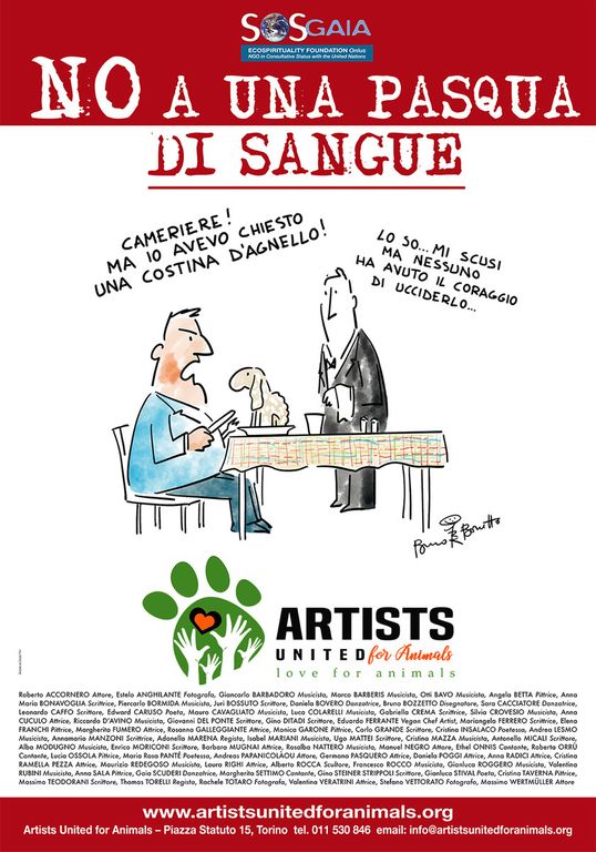 Una delle prime azioni della neonata associazione “Artists United for Animals” è la Campagna “NO A UNA PASQUA DI SANGUE” contro la strage degli agnellini per Pasqua.