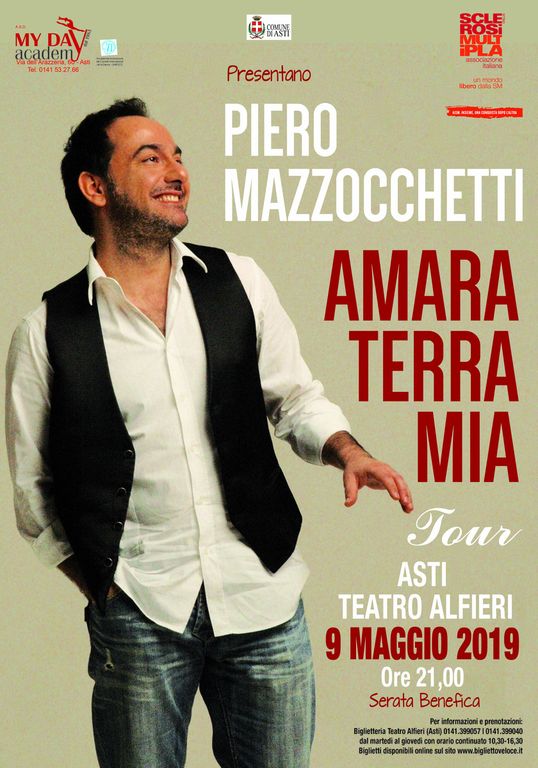 Per l'unica data italiana, dopo Roma l'8 aprile, arriva il tour del tenore abruzzese Piero Mazzocchetti "Amara Terra mia" a favore delle tante attività della sezione astigiana dell' Associazione Italiana Sclerosi Multipla.