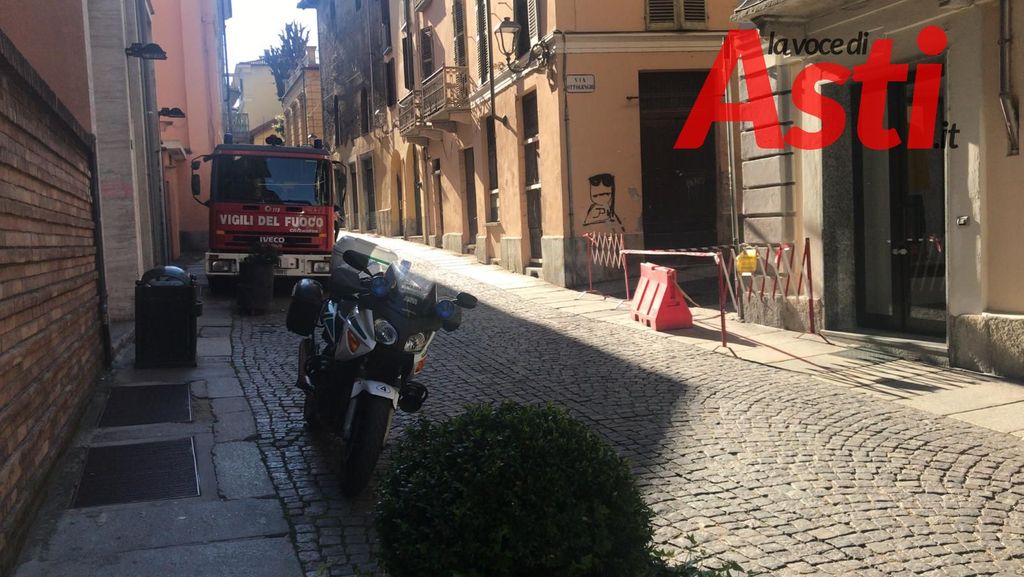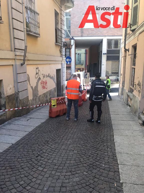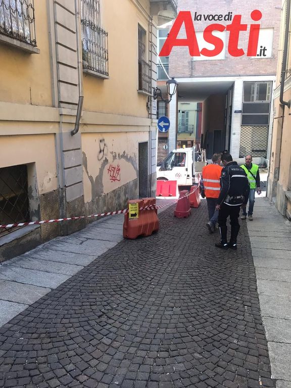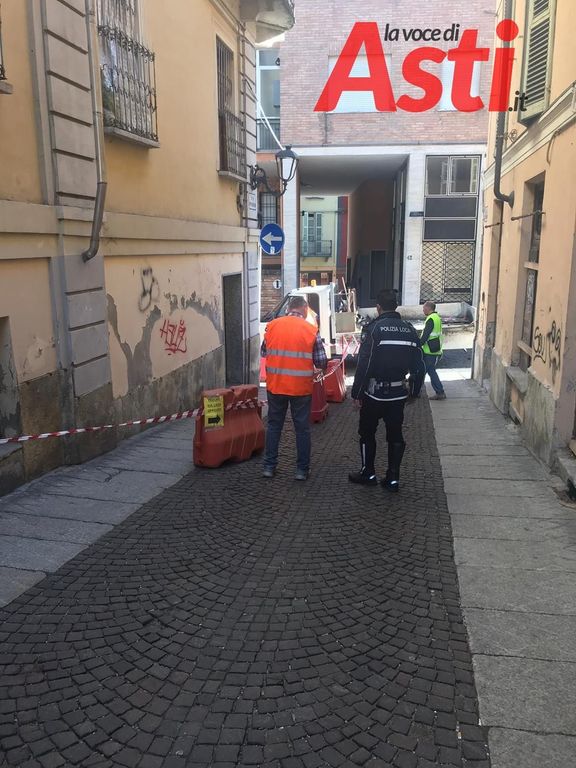 Chiusura al traffico veicolare in via Ottolenghi ad Asti, allo sbocco su via Aliberti, per un balcone pericolante e relativa caduta di calcinacci.