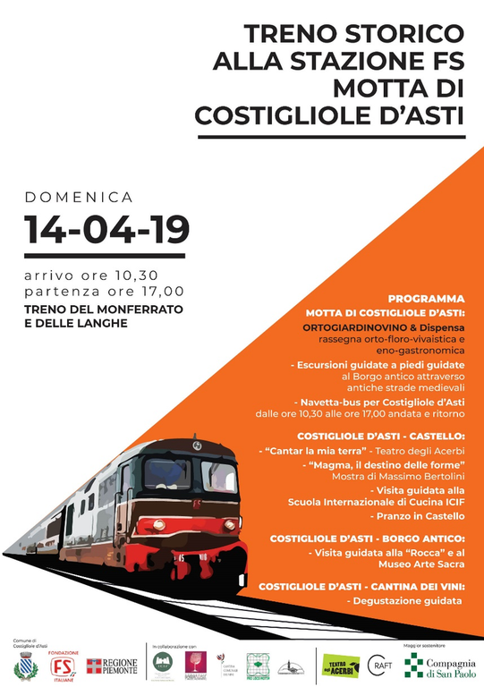 Domenica 14 aprile – in occasione di “Ortogiardinovino & Dispensa”, tradizionale grande rassegna orto-floro-vivaistica e eno-gastronomica della Valle Tanaro, nell’ambito della quale i turisti potranno ammirare e acquistare i prodotti e degustare le specialità del territorio presso lo stand eno-gastronomico allestito dalla Pro-Loco di Motta di Costigliole d’Asti (info e prenotazioni pranzo: cell. 334.9091320) – il Treno Storico del Monferrato e delle Langhe farà sosta nella stazione FS di Motta di Costigliole alle 10.30 e ripartirà alle 17.