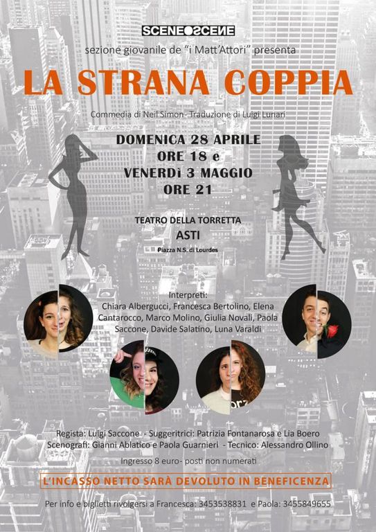 La sezione giovanile dei Matt'attori di Asti presenta "La strana coppia", una rivisitazione della commedia di Neil Simon, questa sera, venerdì 3 maggio alle 21, presso il Teatro della Torretta (piazza N.S. di Lourdes).