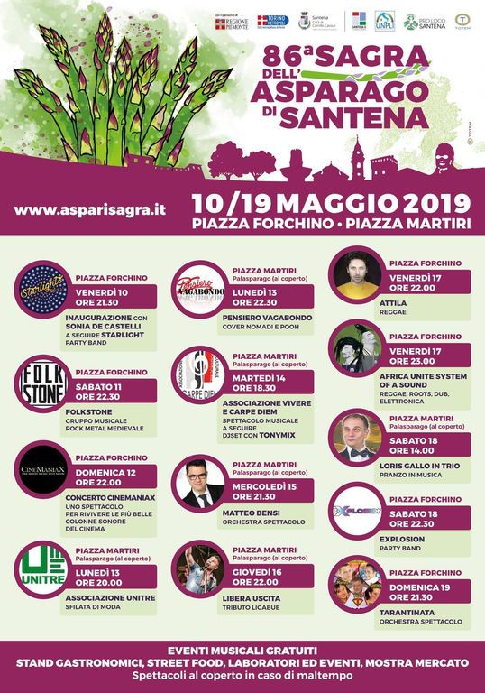 L’86esima Sagra dell’Asparago di Santena (TO), in programma dal 10 al 19 maggio prossimi, si preannuncia ricca di novità e di eventi che accontentano tutti i gusti del pubblico.