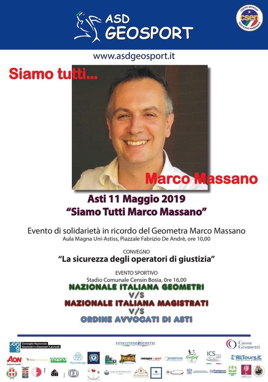 Ad Asti la Geosport (Associazione Sportiva Nazionale dei Geometri e G.L. Liberi Professionisti), da sempre impegnata in attività di solidarietà e formazione, ha organizzato un evento che, attraverso una partita “del cuore” , desidera fare aggregazione e solidarietà per la famiglie e attraverso un convegno stimolare un dibattito serio e costruttivo affinché simili tragedie non debbano ripetersi mai più.