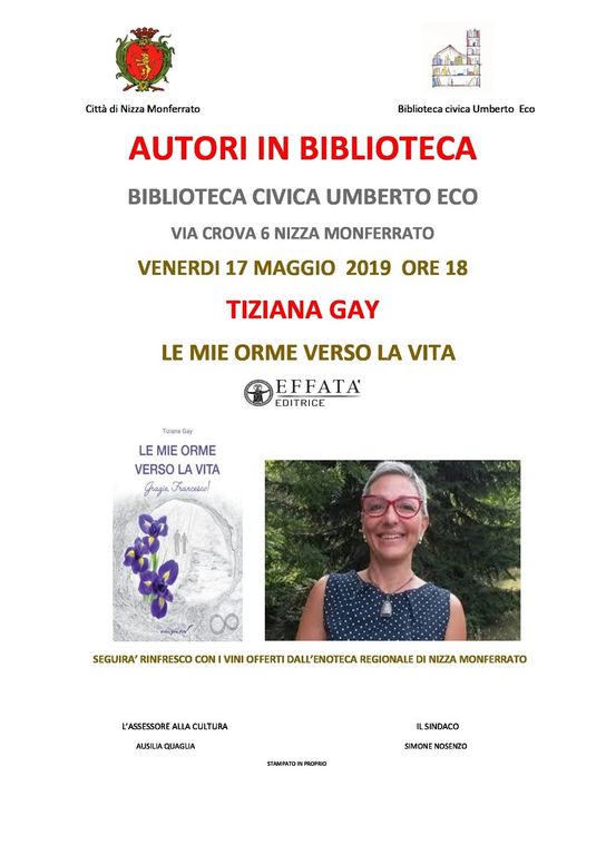 Venerdì pomeriggio alle 18, presso la Biblioteca civica Umberto Eco di Nizza Monferrato, si svolgerà la presentazione del libro di Tiziana Gay intitolato “Le mie orme verso la felicità” (Edizioni Effatà)