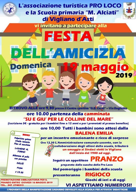 Dopo la sgradita visita dei ladri del mese scorso la Pro Loco di Vigliano d’Asti riprende le manifestazioni in programma per l’anno 2019 con la FESTA DELL’AMICIZIA , giornata benefica a favore della scuola primaria del paese. L’appuntamento è per le ore 9,30 di domenica 19 maggio 2019 presso il centro sportivo “G.B.CONTI” di Via Boglietto 5 a Vigliano d’Asti.