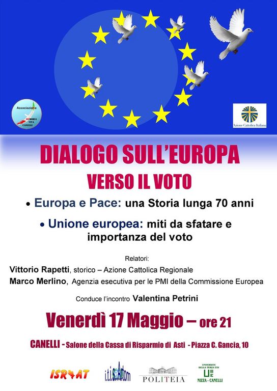 Se ne parlerà con Vittorio Rapetti, storico, che spiegherà come il processo di unificazione europea abbia rimosso, negli ultimi settant'anni, molte tra le cause più comuni delle guerre del passato, garantendo ai Paesi aderenti svariati decenni di pace. Sarà poi il turno di Marco Merlino, canellese trapiantato a Bruxelles e Project Manager presso l'Agenzia per le piccole e medie imprese della Commissione europea EASME, che confuterà alcune tra le notizie fuorvianti che circolano attorno all' UE e argomenterà sull'importanza di un voto consapevole, che trascenda le vicende locali e nazionali.