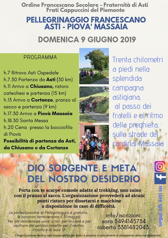 Domenica 9 giugno, per il quarto anno consecutivo, la fraternità dell’Ordine Francescano Secolare di Asti organizza il pellegrinaggio francescano Asti - Piovà Massaja. L’iniziativa nata nell’Anno della Misericordia è volta a riconoscere nell’esempio del Cardinal Massaja, al quale la fraternità astigiana è intitolata, un maestro nel cammino verso Dio attraverso l’amore portato ai fratelli. Il tema di quest’anno sarà: DIO SORGENTE E META DEL NOSTRO DESIDERIO.