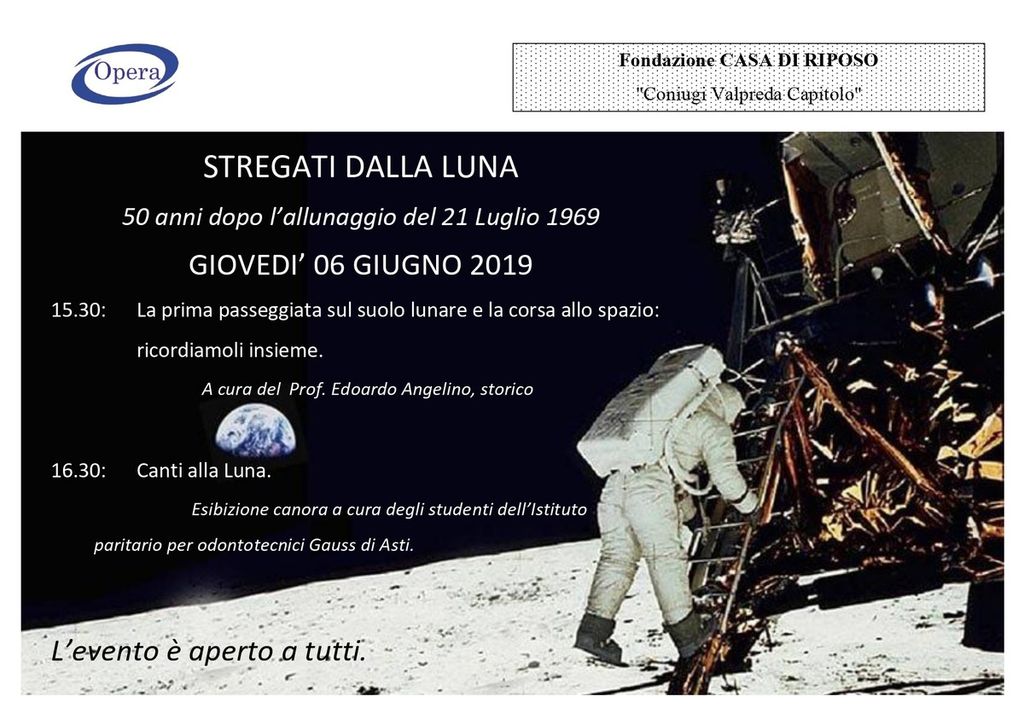 Alle 15.30 Edoardo Angelino, già insegnante di storia e filosofia al Liceo Scientifico “F. Vercelli” di Asti, coinvolgerà gli ospiti nel ricordo della storica impresa con l’intervento “La prima passeggiata sul suolo lunare e la corsa allo spazio”. A seguire i ragazzi del “Gauss” intratterranno gli anziani con un’esibizione canora che avrà per tema la luna.