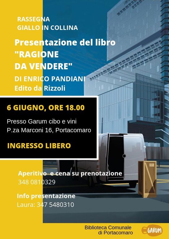 Giovedì 6, alle 18, da GARUM, cibo e vini (presso la ristrutturata Bottega del grignolino) in piazza Marconi 16, a Portacomaro paese, verrà dunque presentato l’ultimo libro di Enrico Pandiani, "Ragione da vendere" (Nero Rizzoli)