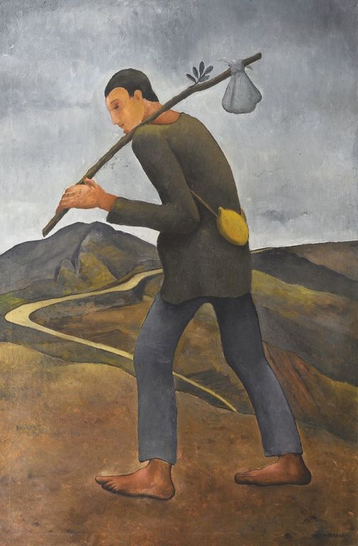 Influenzato dal “primitivismo neogiottesco” di Carrà, nella seconda metà degli anni ’20, l’artista alessandrino elabora l’icona più caratteristica della sua pittura, la figura del viandante, intrisa di pauperismo francescano e avvolta da un intenso afflato spirituale che si rivela nelle sue tavole di viandanti e nelle sue mistiche Annunciazioni ispirate al Beato Angelico. E’ampiamente documentata anche la fase del suo “primitivismo agreste”, fortemente radicata nella terra monferrina, con le famiglie contadine ritratte nella quiete idilliaca delle pause di lavoro, con i balli dei momenti di festa e i mercati del bestiame che si svolgevano sotto gli alberi nelle periferie dei paesi. Ma anche paesaggi con marine dipinte in compagnia dell’amico Carrà, e significativi scorci di paesi del Monferrato dove era solito recarsi in bicicletta. La sezione si chiude con alcuni quadri che documentano gli umori e le speranze alla fine del conflitto.
