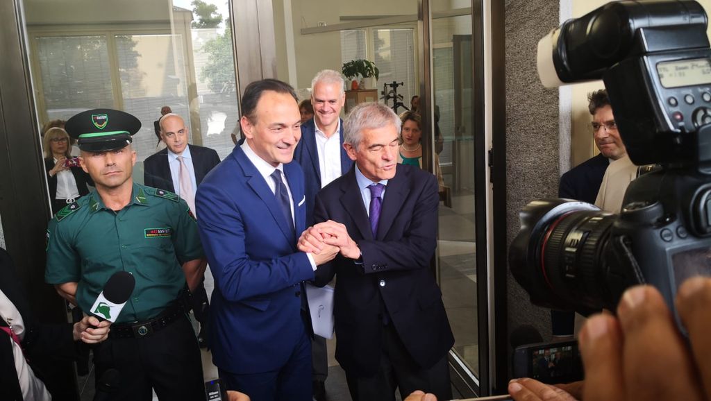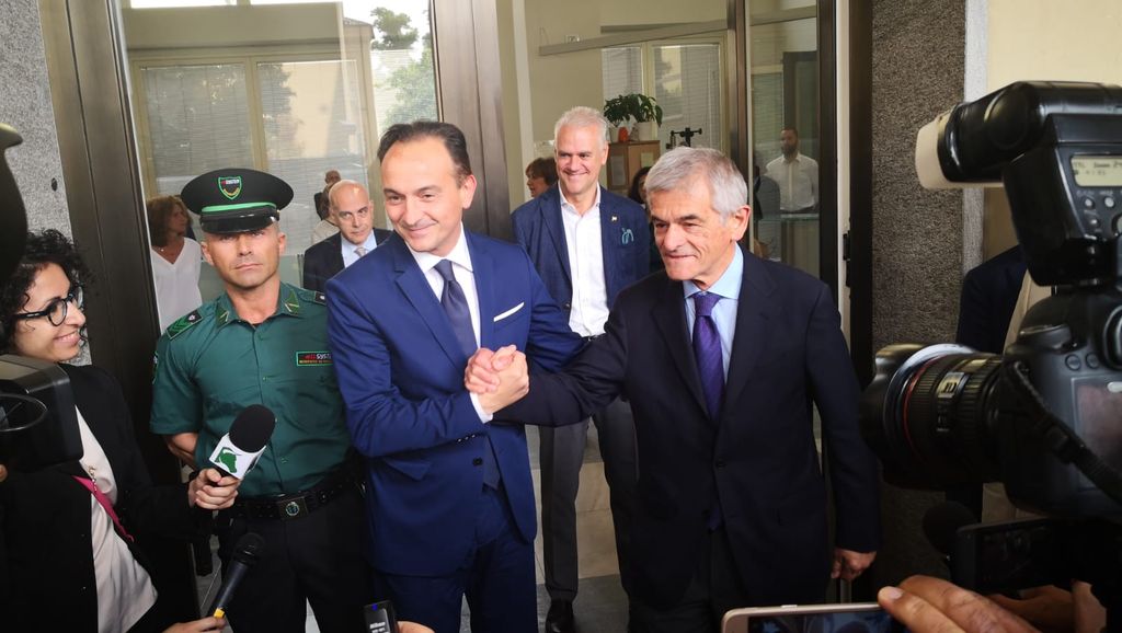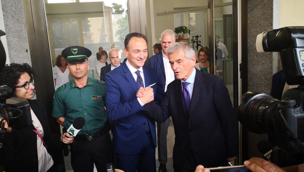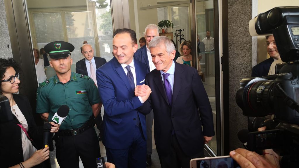 Una stretta di mano cordiale e un abbraccio sorridente questa mattina alle 10 tra il neo Presidente della Regione Piemonte Alberto Cirio e il governatore uscente Sergio Chiamparino all'ingresso del Palazzo della Giunta, dove si è svolto lo scambio di consegne.