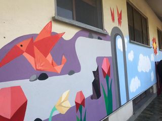 Le pareti esterne del nido che circondano il giardino sensoriale sono state successivamente impreziosite e colorate con un gioioso murales, realizzato da un gruppo di studentesse del Liceo Artistico B. Alfieri, impegnate in una progettualità di alternanza scuola lavoro.