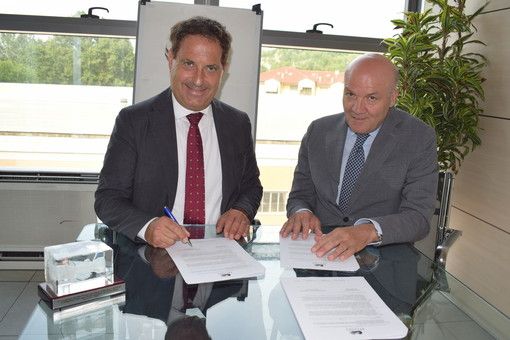 L'amministratore delegato del Gruppo Egea PierPaolo Carini insieme a Carmine Maffettone, che insieme al figlio Vincenzo dirige le sedi di Alba e Bra dell'Università Pegaso
