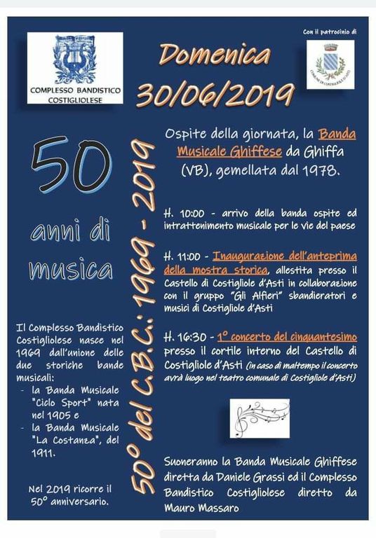 Infine, domenica 30 giugno, chiusura in bellezza all’insegna della musica per festeggiare i 50 anni dalla formazione del Complesso Bandistico Costigliolese, nato nel 1969 dall’unione tra la Banda Musicale “Ciclo Sport” nata nel 1905 e la Banda Musicale “La Costanza” del 11911. La giornata, che vedrà ospite la Banda Musicale Ghiffese (VB), gemellata con quella costigliolese fin dal 1978, si aprirà alle 10 con l’arrivo della Banda ospite che proporrà intrattenimento musicale per le vie del paese. Alle 11 è in programma l’inaugurazione della mostra storica allestita presso il castello del paese, mentre alle 16.30 si svolgerà il concerto del cinquantesimo, in programma presso il cortile interno del castello che vedrà protagoniste la Banda Ghiffese diretta da Daniele Grassi e quella costigliolese diretta da Mauro Massano.