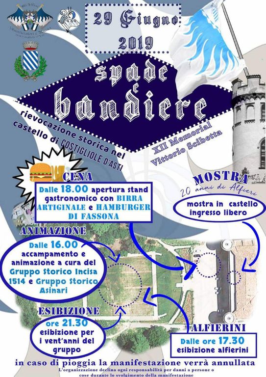 Il prossimo fine settimana costigliolese si preannuncia davvero ricco di appuntamenti, in grado di interessare-soddisfare una variegata tipologia di pubblico. Ma andiamo con ordine, iniziando dal raccontare dettagliatamente il programma della manifestazione “Spade e bandiere”, XII Memorial Vittorio Scibetta, in programma dalle 16 presso il castello del paese. Per l’appunto da quell’ora verrà allestito un accampamento, fedele ricostruzione storica, e vi sarà relativa animazione a cura del Gruppo Storico Incisa 1514 e del Gruppo Storico Asinari. Alle 17.30 è in previsione l’esibizione degli “alfierini”, mentre lo stand gastronomico che proporrà birra artigianale e hamburger di Fassona sarà attivo dalle 18. Alle 20 è in programma la mostra “20 anni di Alfieri” (ingresso libero), mentre la serata verrà chiusa, alle 21.30, dall’esibizione allestita per celebrare i 20 anni del gruppo. In caso di maltempo la manifestazione verrà annullata.