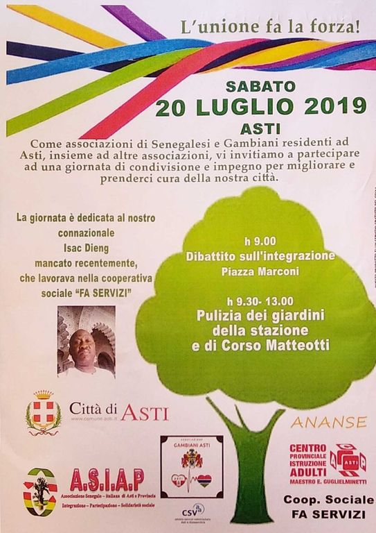 La giornata verrà dedicata alla memoria di Isac Dieng, socio-lavoratore della cooperativa “Fa Servizi” prematuramente mancato nel maggio scorso. “Isac era un socio-lavoratore indefesso, oltre che una gran brava persona – ha affermato Adriano Farinetti, responsabile della cooperativa – In corso Matteotti tanti lo conoscevano perché lo vedevano girare a bordo dell’apetta con la quale ripulivamo la zona. Noi sabato saremo presenti in sua memoria, perché il cambiamento può avvenire solo lavorando tutti insieme, giorno per giorno”.