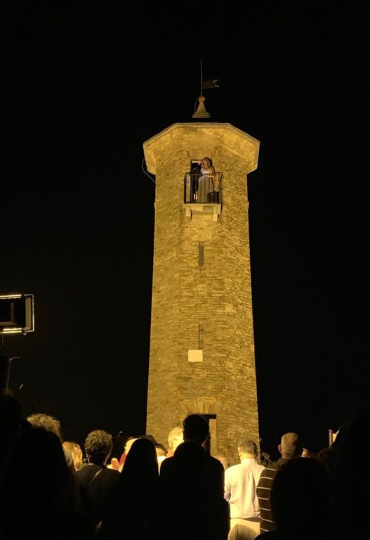 Molto suggestiva la declamazione delle poesie e dei brani di Leopardi, D’Annunzio e Pirandello dalla cima della Torre dei Contini, col meraviglioso panorama a 360 gradi delle colline illuminate.
