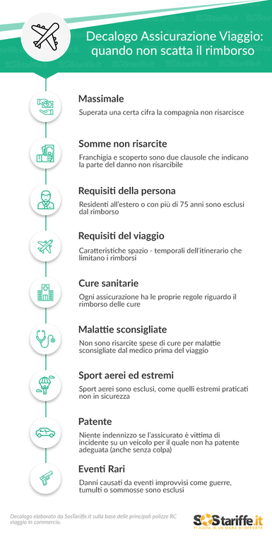 Per prevenire delusioni, ecco il decalogo di SosTariffe.it, da conservare con cura. Ovviamente, ogni impresa si regola come crede, ma i 10 punti che trovate in basso è molto probabile siano inserite in tante delle diverse polizze viaggio in commercio.