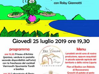 Questa è il primo evento del duo Flavio Corazza/Roby Giannotti, un modo nuovo per promuovere i prodotti della terra ed in particolare della Liguria e gustarseli con un sorriso in luoghi speciali come l’agriturismo Tre Colline in Langa, unendo la promozione dei prodotti di piccole aziende del Piemonte e della Liguria. Ad incorniciare la serata in cui il Basilico genovese dop sarà ospite in Langa Astigiana ci penserà Fabio Baldonivo con la sua musica.....
