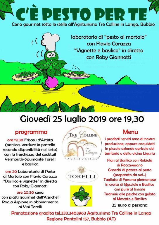 Quando si uniscono una grande agrichef come Paola Arpione, titolare dell'agriturismo Tre Colline in Langa, un testimonial importante del pesto come Flavio Corazza e un vignettista da anni impegnato nella Langa Astigiana a vignettare sui prodotti di eccellenza..non può che nascere “C'E' PESTO PER TE”, una serata dedicata al Basilico Genovese dop con Flavio Corazza,che vi guiderà in un esperienza unica, fare il pesto al mortaio , proverete voi stessi a fare il vero Pesto Genovese.......inizieremo con un aperitivo , un fresco cocktail con vini e vermouth bio Torelli e basilico accompagnato da stuzzichini che arriveranno dalla liguria e dal nostro territorio. A seguire un menù dove il basilico e il pesto incontrano i prodotti dop e igp e docg della langa astigiana, in abbinamento a ogni portata Gianfranco Torelli servirà i suoi vini bio.