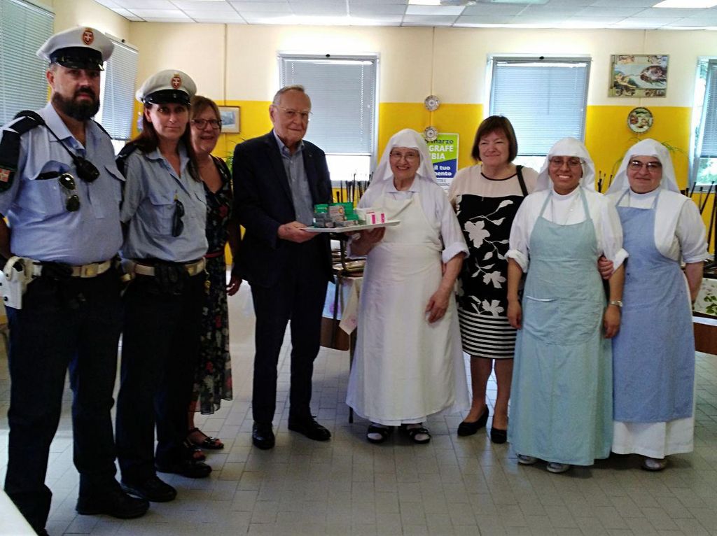Nella foto, da sinistra: l'agente Danilo Aluffo, l'agente scelto Francesca Fichera, la dottoressa Paola Imarisio (ass. Dono del Volo), il dott. Maggiora, suor Luigina, l’assessore Mariangela Cotto e altre due suore impegnate presso la struttura di corso Genova