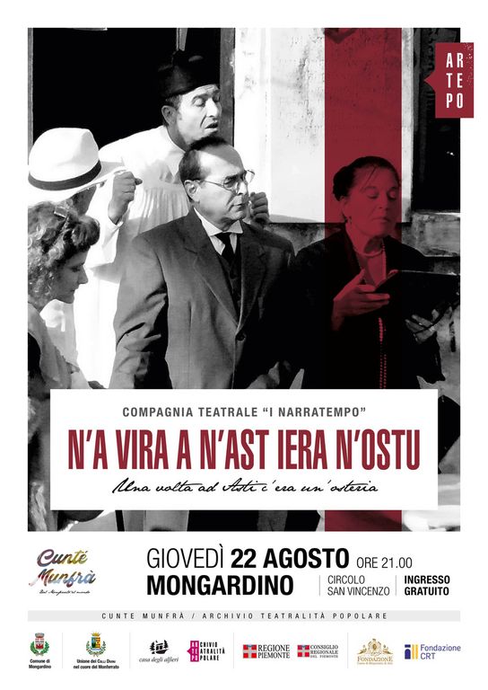 Il 22 Agosto alle 21 al Circolo San Vincenzo di Mongardino, la Compagnia teatrale "I Narratempo" presenta"N'a vira a n'Ast iera n'ostu" ( Una volta ad Asti c'era un'osteria), commedia brillante, con musica dal vivo.