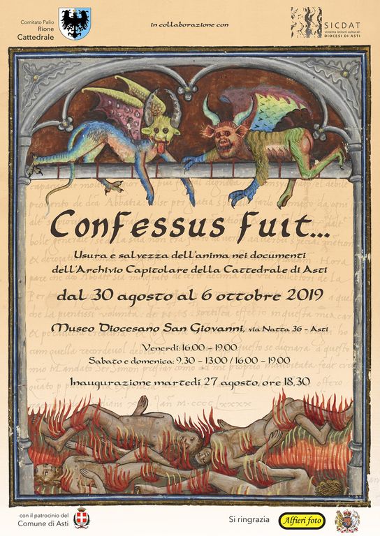 A seguito del successo ottenuto in occasione delle mostre “50 anni di passione Bianco - Azzurra. Il Rione Cattedrale si racconta” e “Et ego scripsi. La Cattedrale e il suo Archivio. Storie di donne, storie di una terra” il Comitato Palio Rione Cattedrale, in collaborazione col Museo Diocesano San Giovanni, l’Archivio Capitolare e la Biblioteca Vescovile, organizza la mostra “Confessus fuit. Usura e salvezza dell’anima nei documenti dell’Archivio Capitolare della Cattedrale di Asti”.