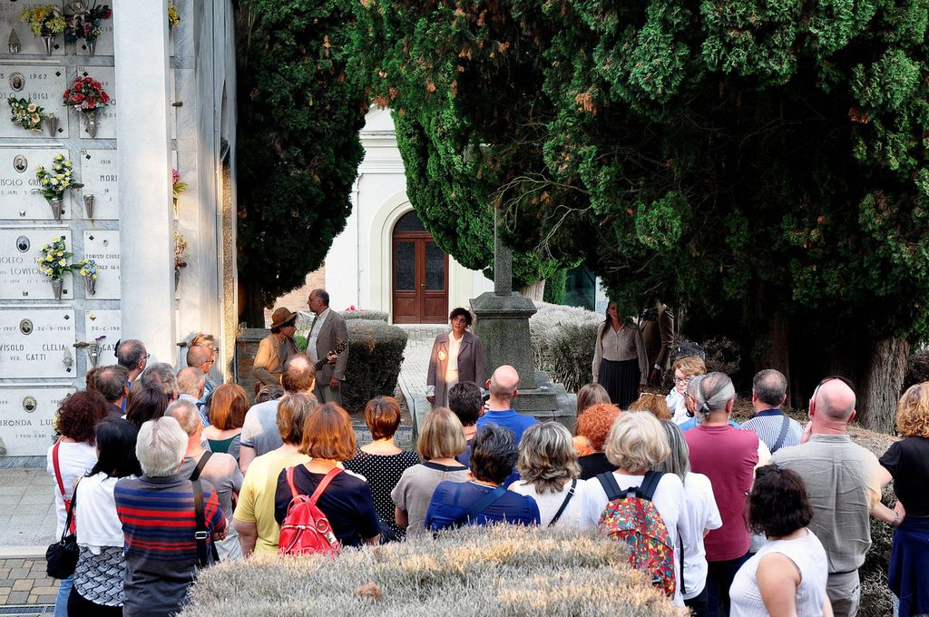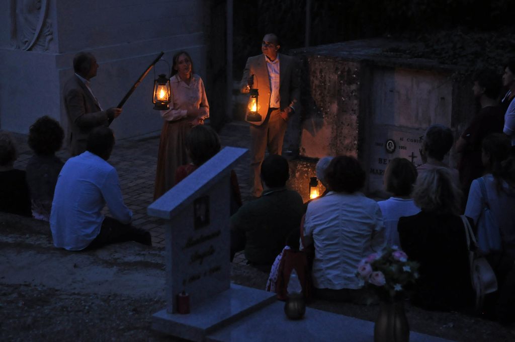 Gli attori e il musicista appaiono e scompaiono tra le tombe, conducendo a gruppi gli spettatori in un percorso tra le lapidi di pietra, gli alberi e i cespugli che da soli compongono la più perfetta delle scenografie. Le note e le parole in un cimitero hanno più peso perché si è più disposti all’ascolto, si è più abituati al silenzio; e le note e le parole risuonano più pure invitandoci ad alzare lo sguardo verso il paesaggio, verso i luoghi dove queste persone che ci parlano abitavano e animavano: vite tragiche o monotone, insignificanti, piene di cose da fare ma tutte ugualmente riassunte qui ed ora.