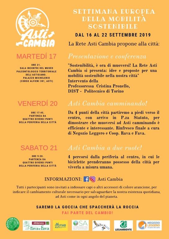 Migliaia di città e milioni di cittadini europei si preparano a celebrare la Settimana Europea della Mobilità, dal 16 al 22 settembre 2019. E anche Asti sarà in prima fila, grazie allo sforzo che le associazioni, i movimenti e i singoli cittadini riuniti nella Rete Asti Cambia hanno deciso di attuare per accendere i riflettori sulla sicurezza del camminare e dell'andare in bicicletta in città e sui vantaggi che la mobilità "dolce" può offrire alla nostra salute, al nostro ambient