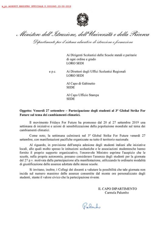 Quella del ministro dell’Istruzione Lorenzo Fioramonti che, per tramite di un post pubblicato sul suo profilo Facebook personale, ha reso noto i contenuti di una circolare inviata ai Direttori degli Uffici Scolastici Regionali e ai Dirigenti Scolastici delle Scuole statali e paritarie di ogni ordine e grado. Nel documento, il ministro “esprime l’auspicio che le scuole, nella propria autonomia, possano considerare l’assenza degli studenti nella giornata del 27 p.v. (con riferimento a venerdì 27 settembre, data in cui in gran parte d'Italia si svolgeranno manifestazione di protesta globale, ndr.) motivata dalla partecipazione alla manifestazione, utilizzando le ordinarie modalità di giustificazione delle assenze adottate nelle stesse scuole”.