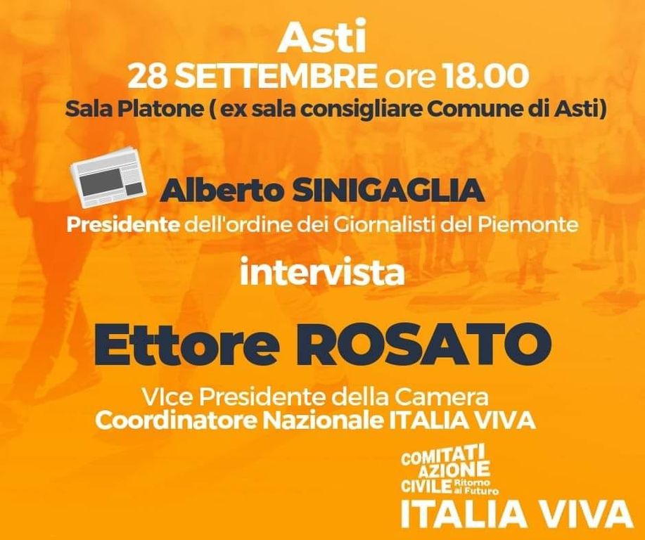 Per capire meglio il progetto di Italia Viva, ad Asti arriva Ettore Rosato, vice presidente della Camera e coordinatore nazionale di Italia Viva.