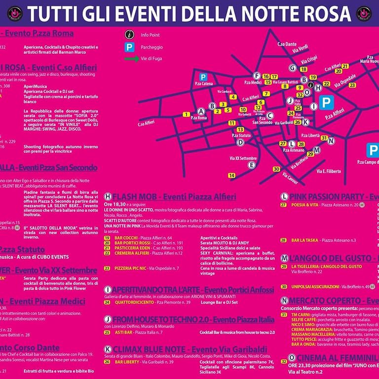 E poi cocktail in rosa, musica, swing, jazz in corso Alfieri , Pasta Party Flower in via XX settembre, il Pink Party in corso Dante, e vari eventi tra portici Anfossi, via Garibaldi, piazza Astesano, via Brofferio.