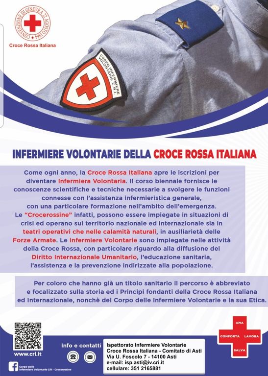 Nella sede dell’Ispettorato delle Infermiere Volontarie presso il Comitato CRI di Asti in via Ugo Foscolo 7, sono aperte le iscrizioni al Corso di formazione per diventare “Infermiera Volontaria”.