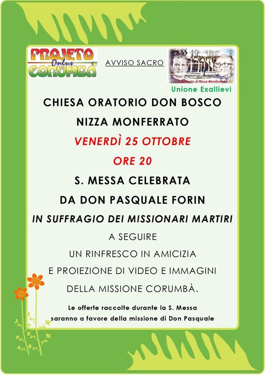 Venerdì 25 ottobre, alle ore 20, la chiesa oratorio don Bosco di Nizza Monferrato ospiterà una cerimonia religiosa davvero molto significativa. Una santa messa in suffragio dei missionari martiri che verrà celebrata da don Pasquale Forin.