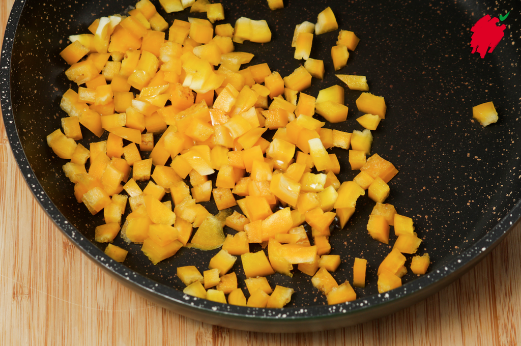 Tagliate i peperoni a pezzetti, fateli cuocere in una padella antiaderente a fuoco vivace con un filo di olio evo.