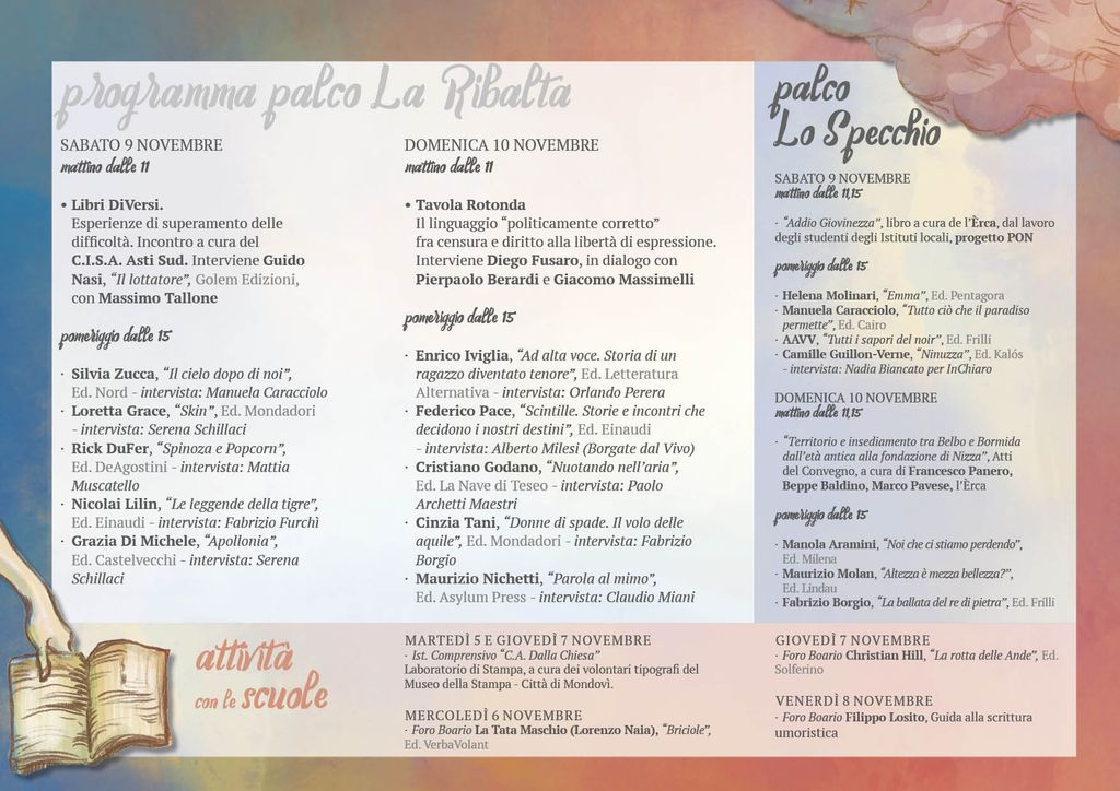Nella settimana precedente il festival al Foro Boario attività con le scuole con gli scrittori La Tata Maschio (Lorenzo Naia), Christian Hill, Filippo Losito e laboratorio di Stampa a cura dei volontari tipografi del Museo della Stampa — Città di Mondovì.